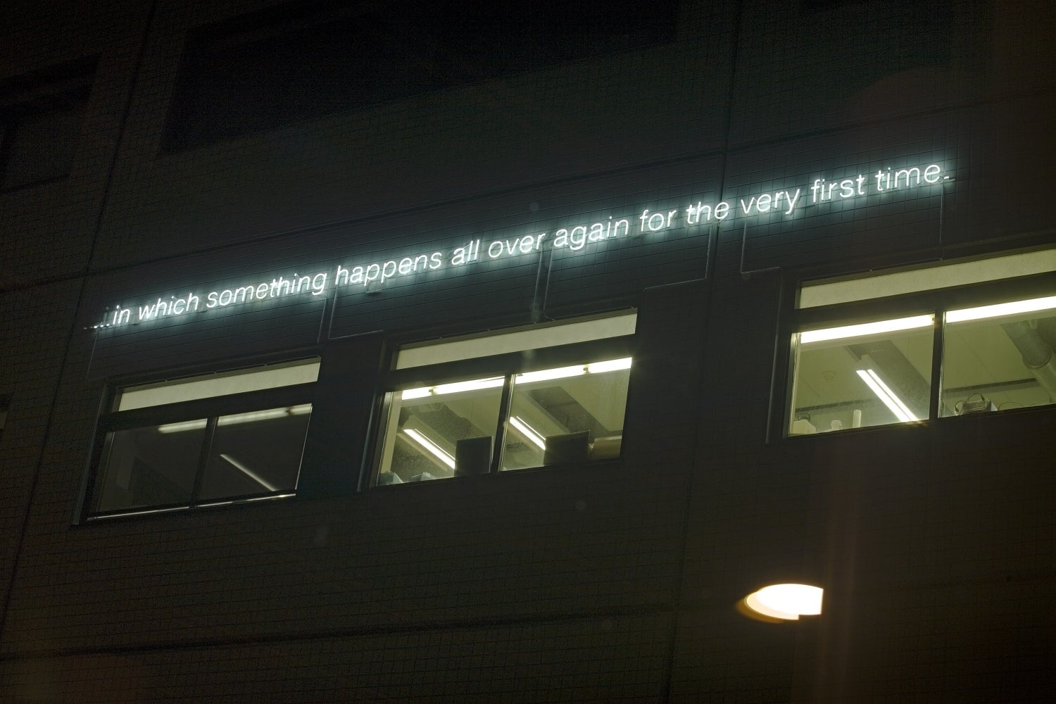 One of the works in this triptych consists of a line of text in neon and is located on the outside wall. The line of text seems to be a subtitle to what is happening in the spaces behind the facade.