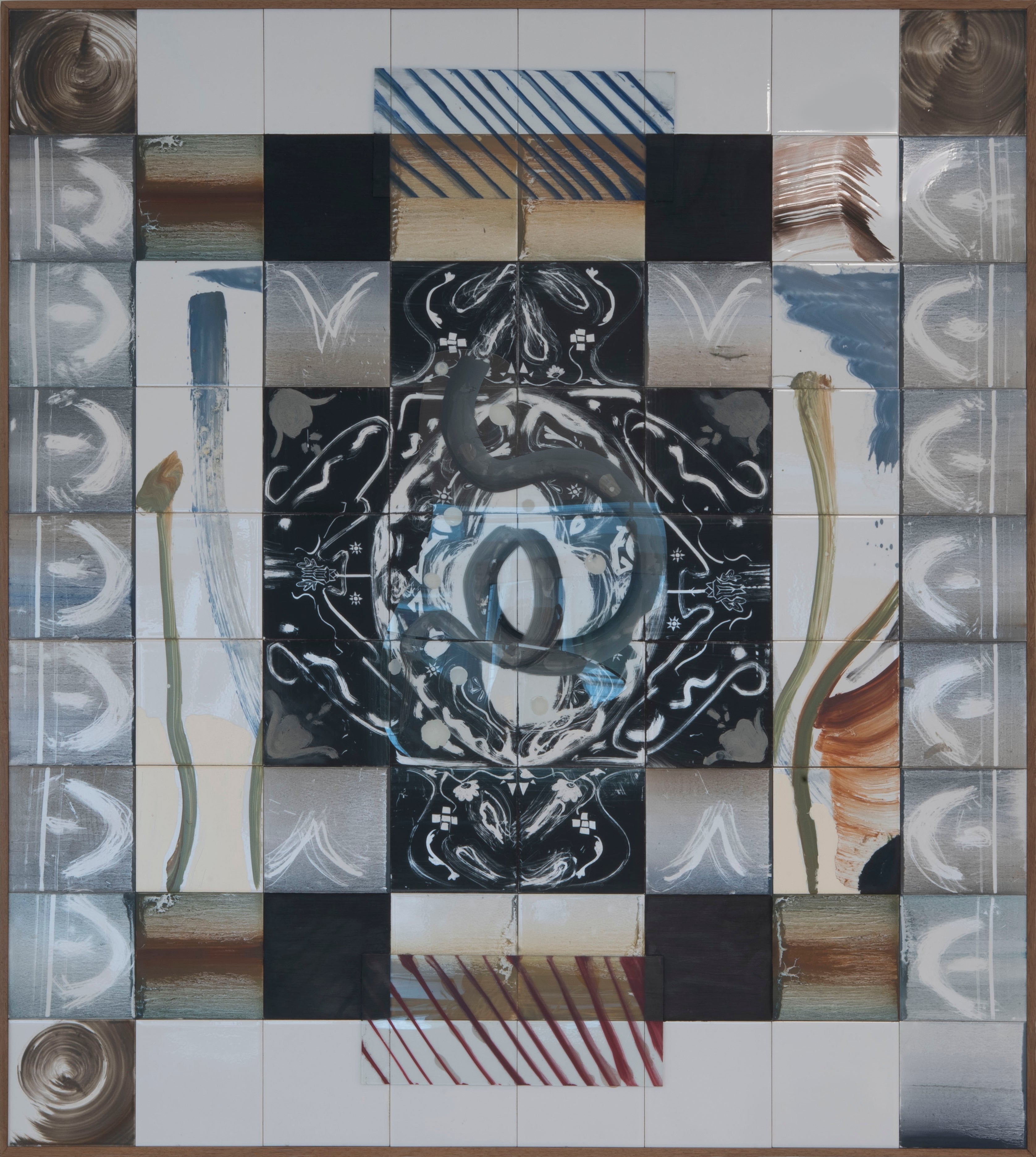 Rabi Koria was of Syrian descent and immigrated to the Netherlands as a five-year-old. His work tells of the search for his identity, which lies somewhere between these two worlds. The painted tile tableaux are inspired by ancient ceramic tiles from Damascus. The mostly abstract forms refer to stories from the Middle East. The work evokes associations with writing, calligraphy and carpet motifs. It won him the Royal Prize for Free Painting in 2015.